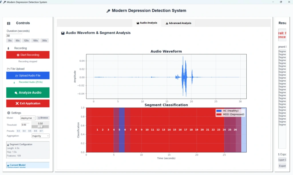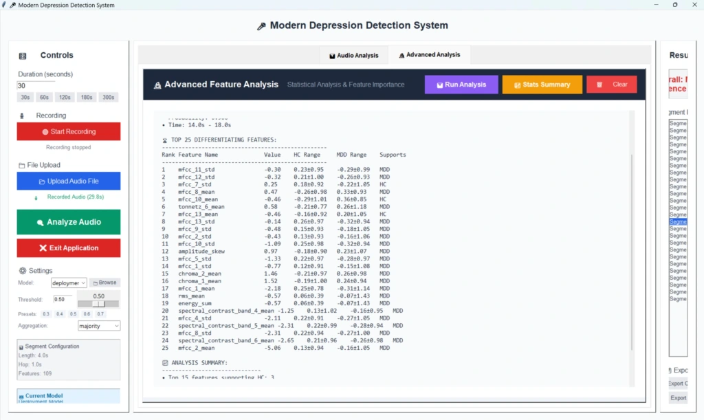 Pavyzdžiui, tyrime nustatyti universalūs biožymenys, tokie kaip sumažėjusi pagrindinio tono dažnio variacija (rodanti monotoniškesnę kalbą), padidėjęs pauzių skaičius ir pakitę tam tikri MFCC koeficientai, apibūdinantys balso spektrines savybes. Šie požymiai iš dalies atspindi psichomotorinį sulėtėjimą ir sumažėjusią balso energiją.